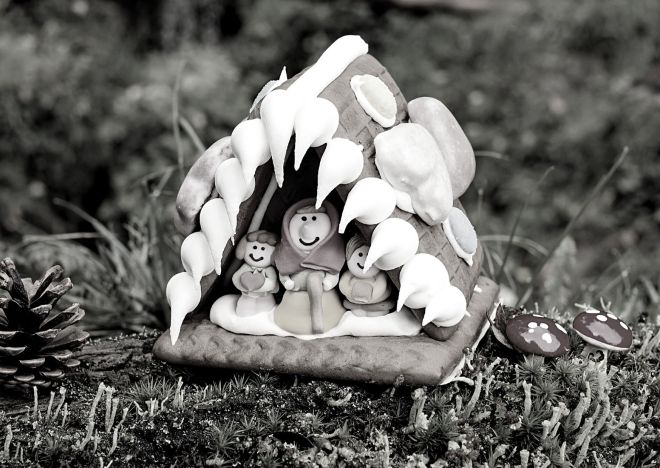 „Babičko, babičko, líznem si jen maličko,“ naléhaly hlásky tak líbezně, že se Ježibaba neudržela a trošku dveře pootevřela. Dovnitř se vedral Jeníček, který hned začal olizovat perníkovou vařečku a v závěsu za ním Mařenka, jež se vrhla na kliky.